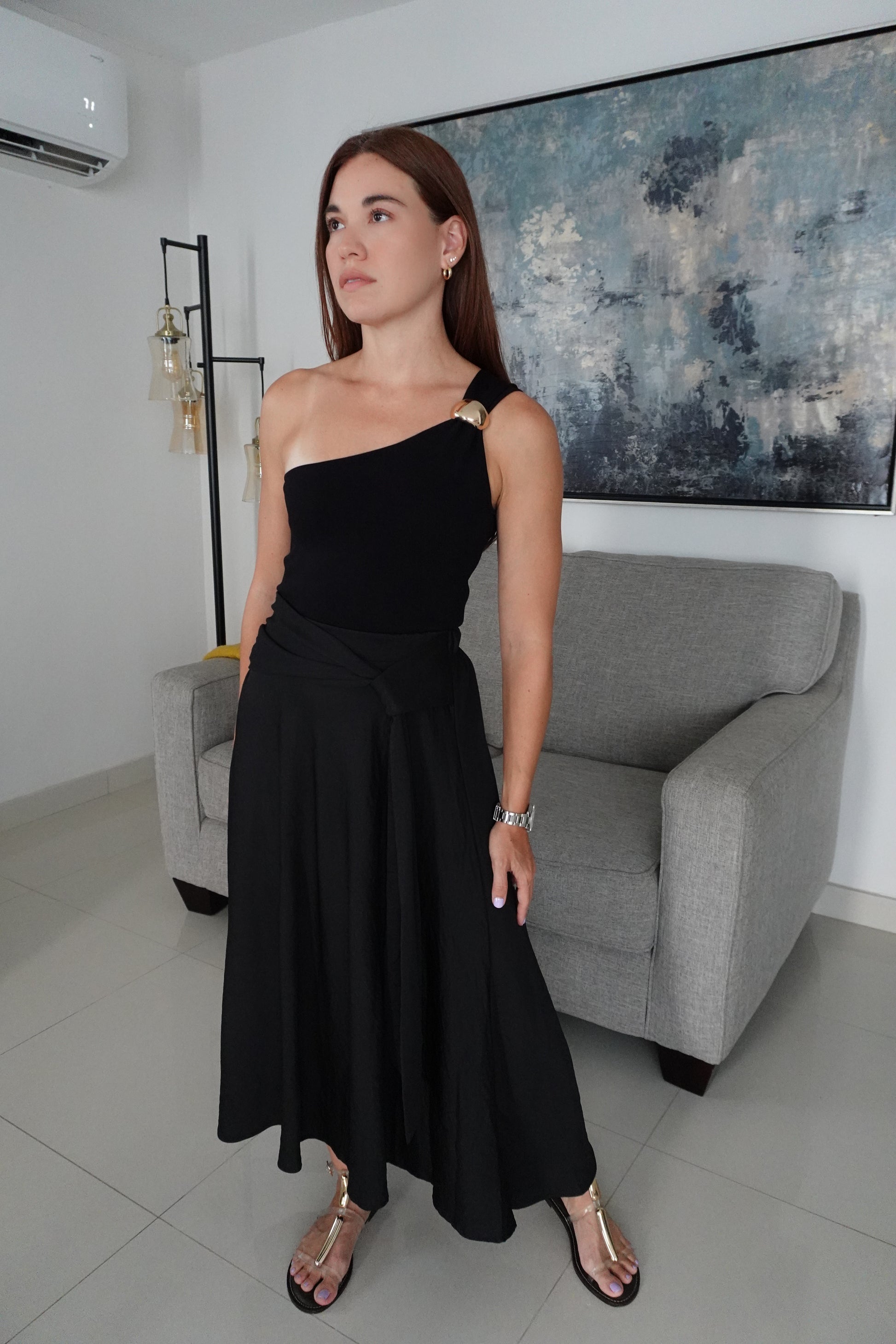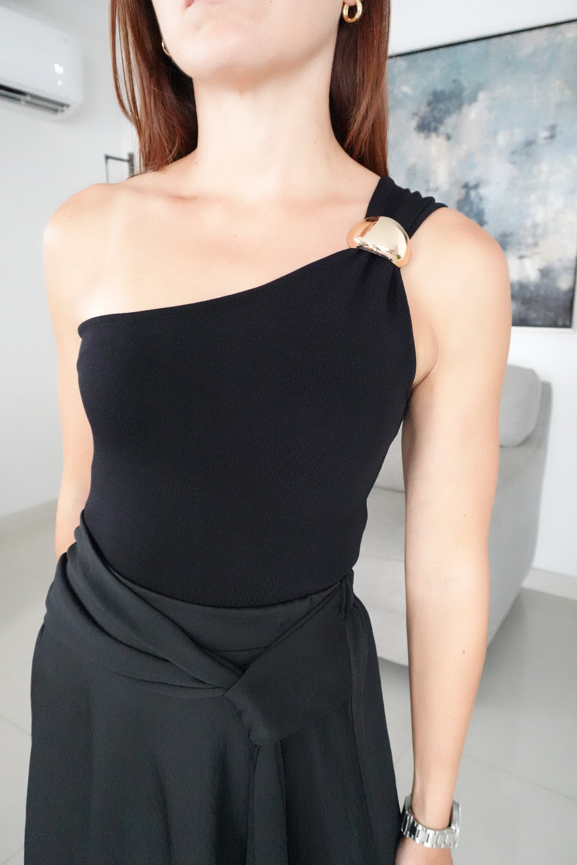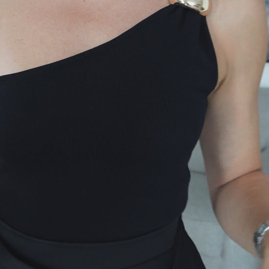 One shoulder top with trim detail.