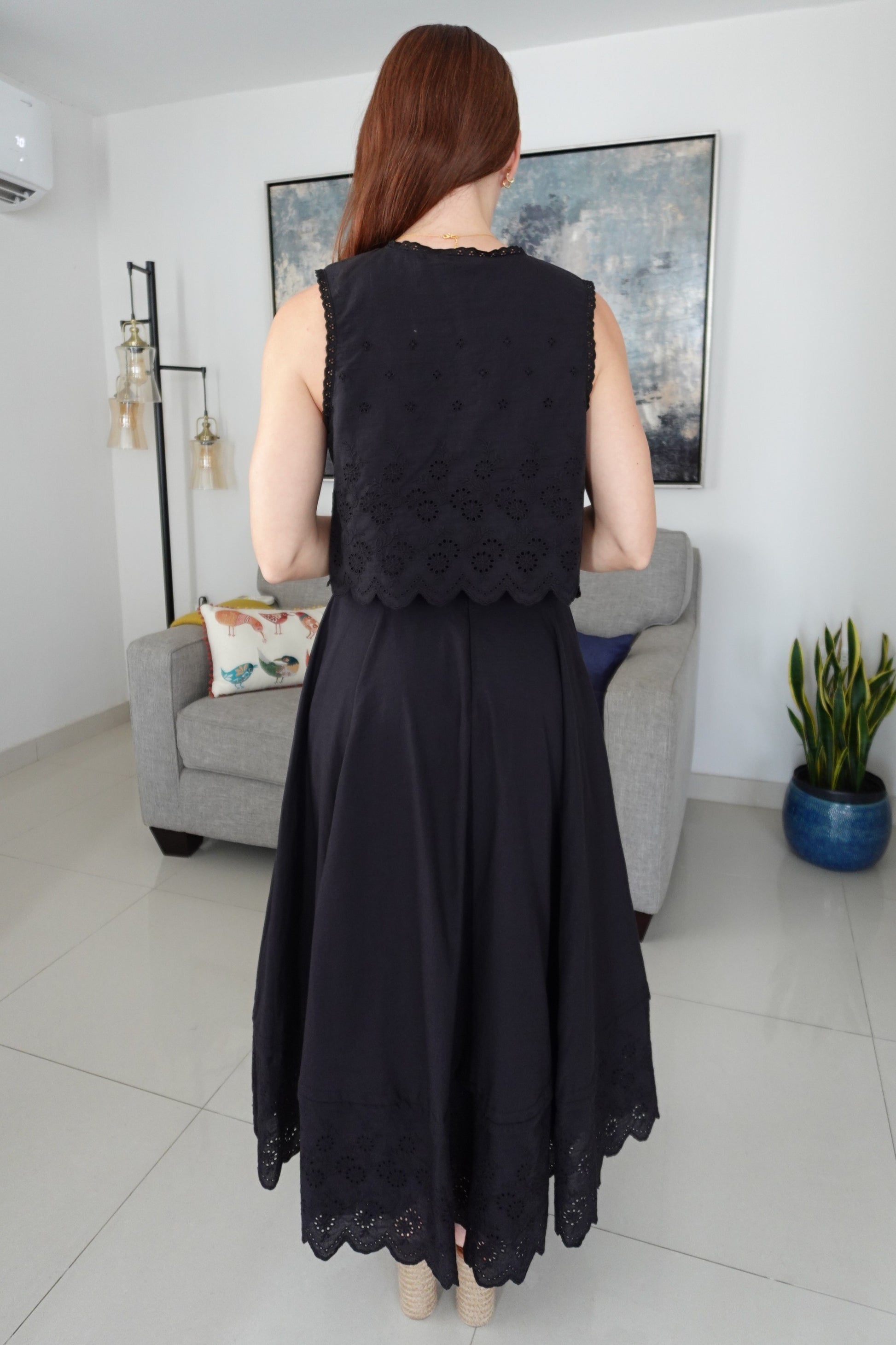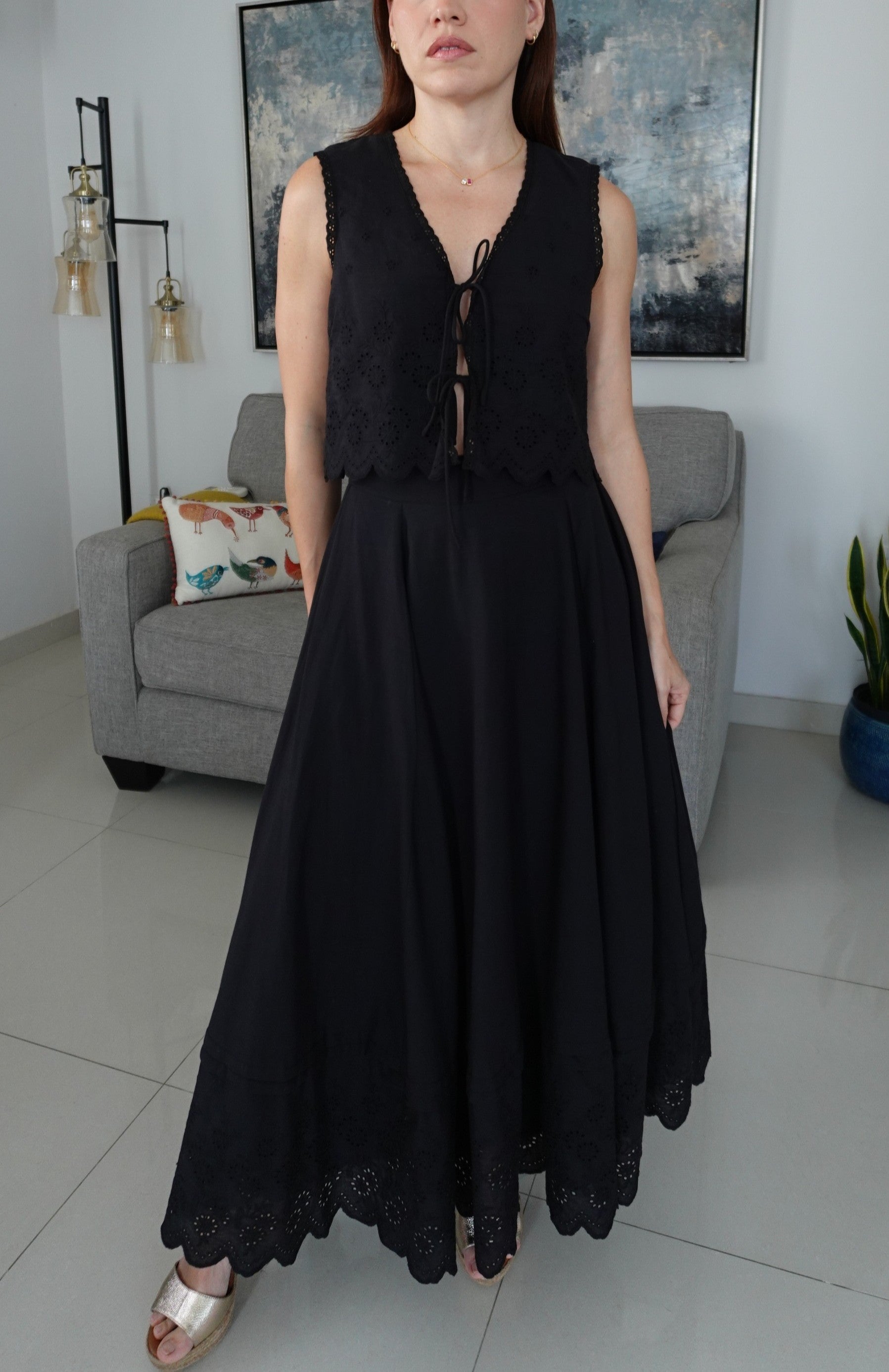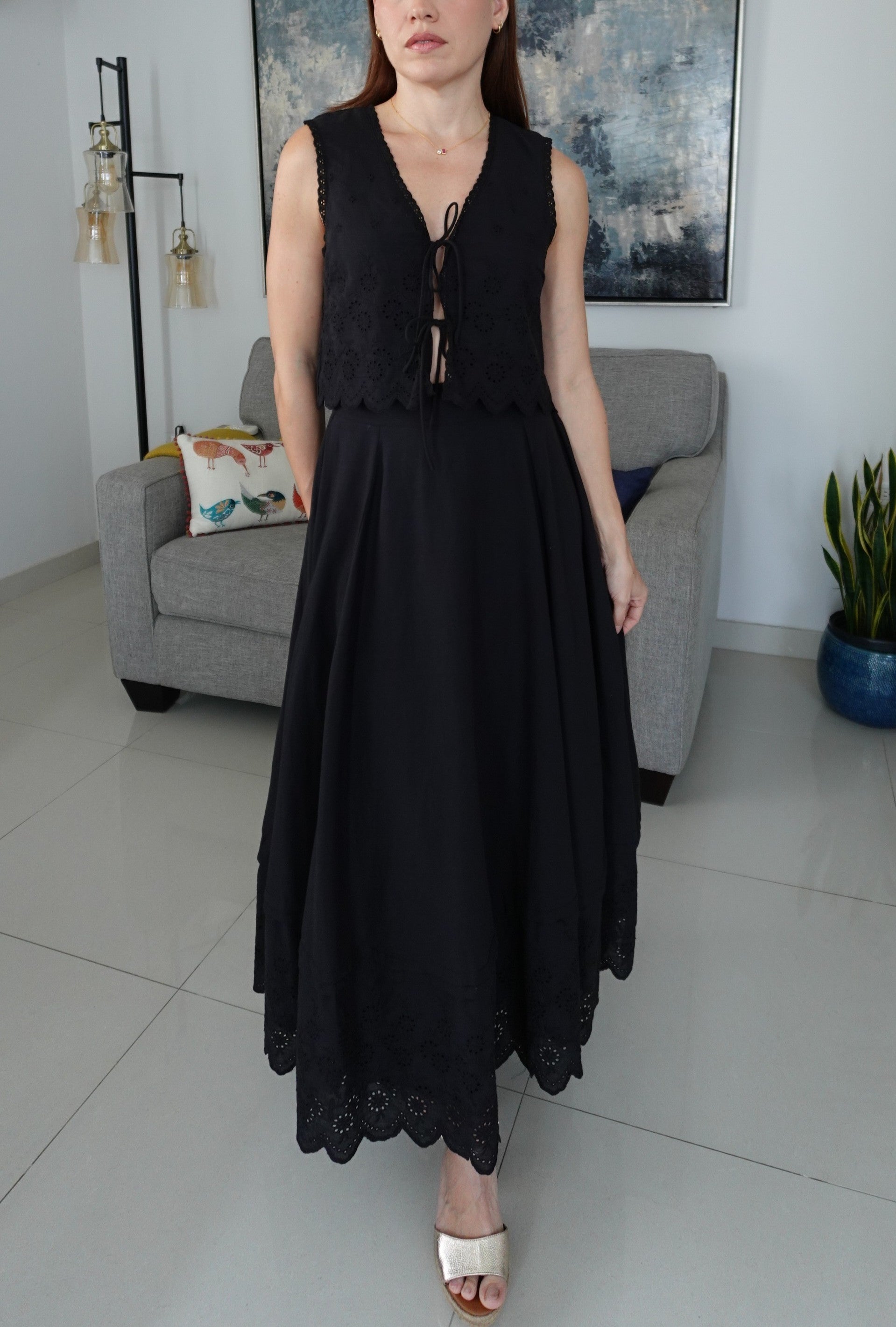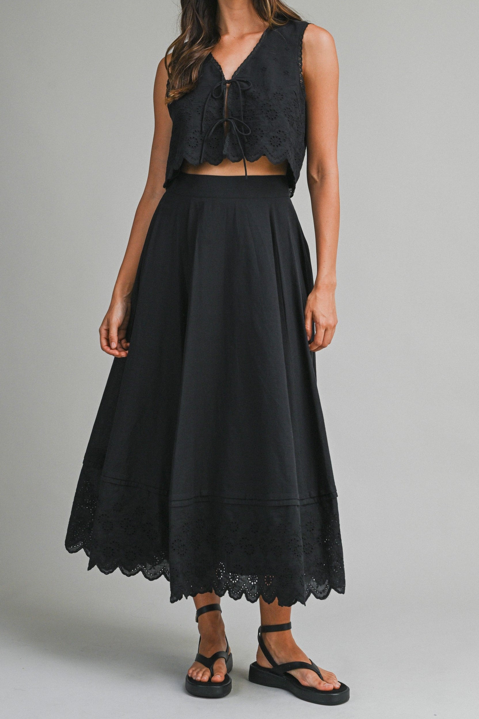 Eyelet embroidery sleeveless scalloped hem crop top with front self tie closure and matching midi skirt set. Skirt has back invisible zipper. Lining.