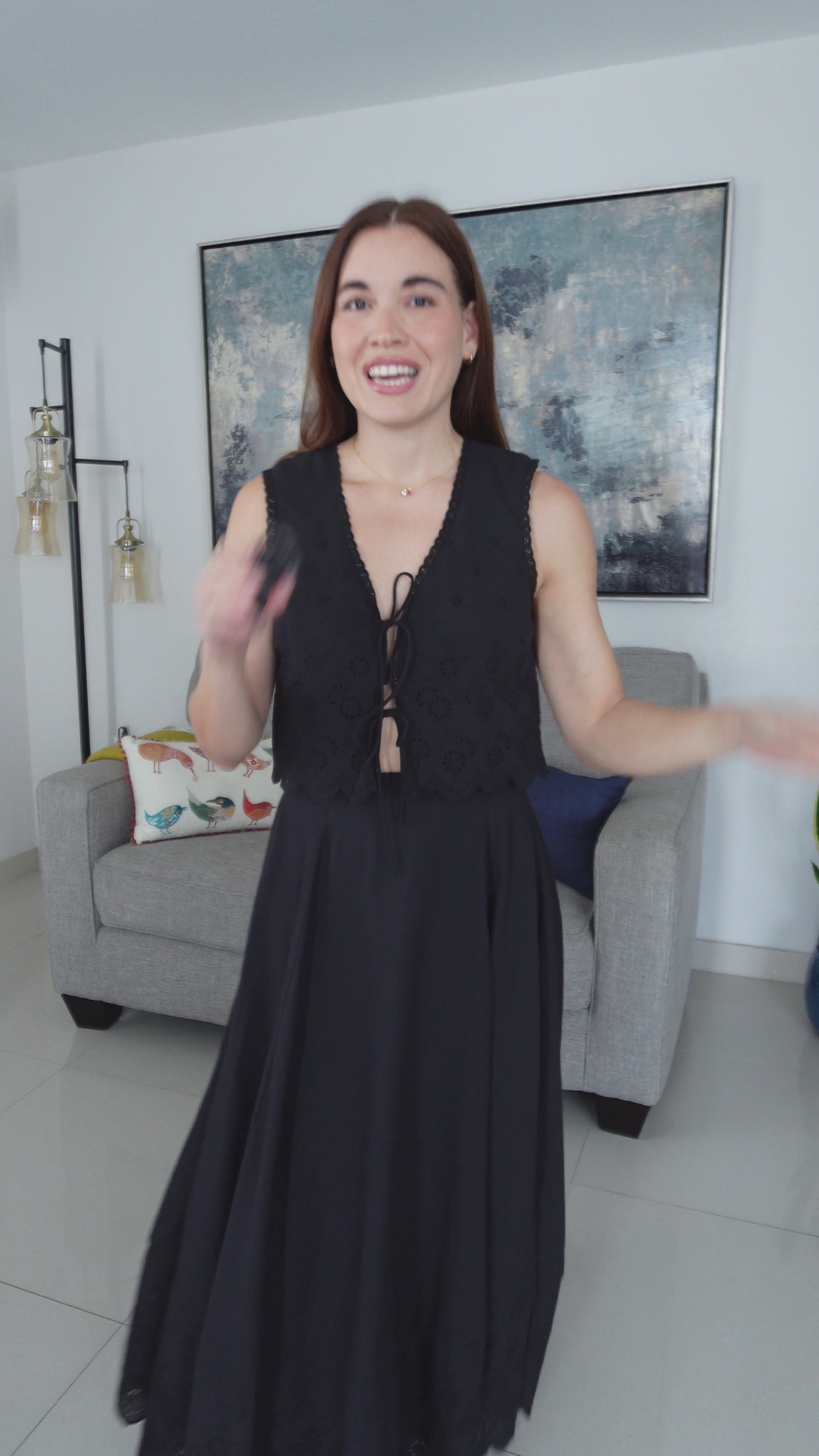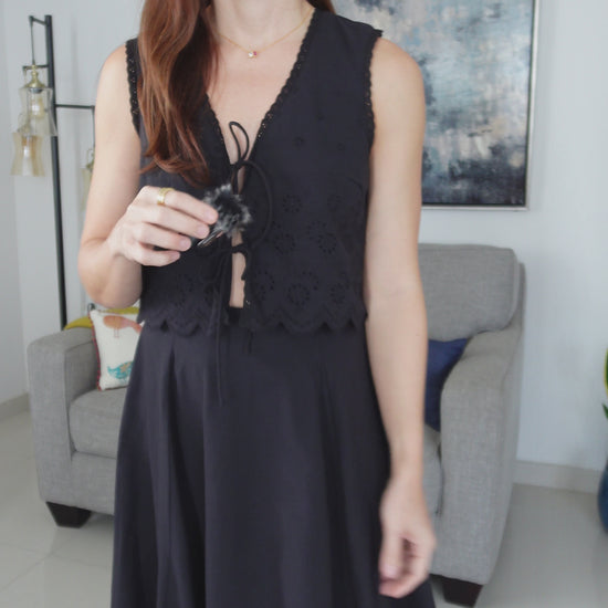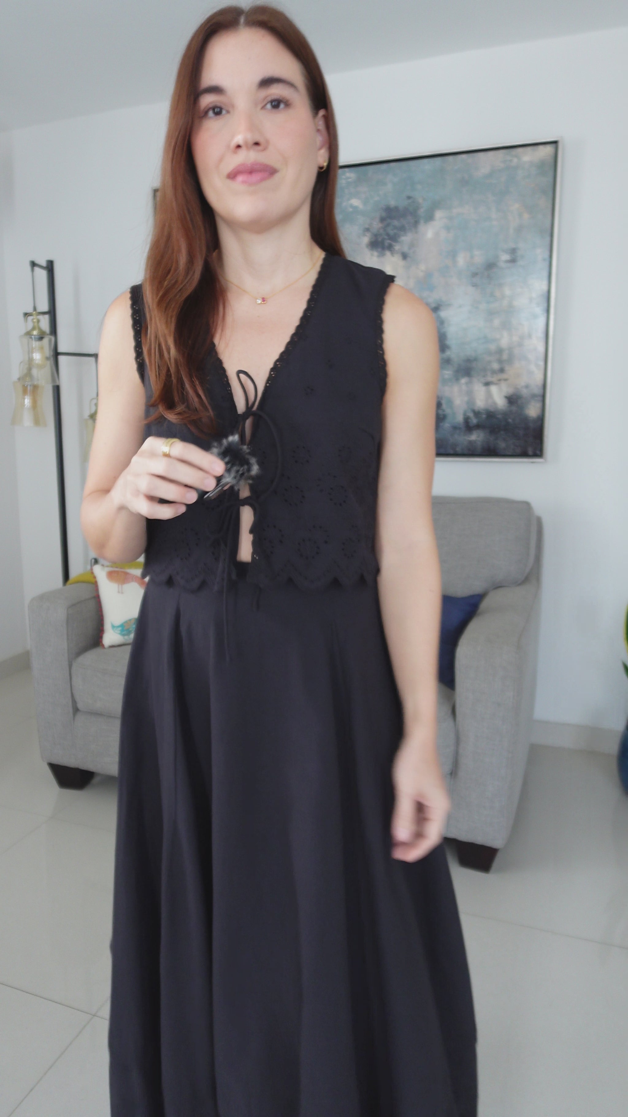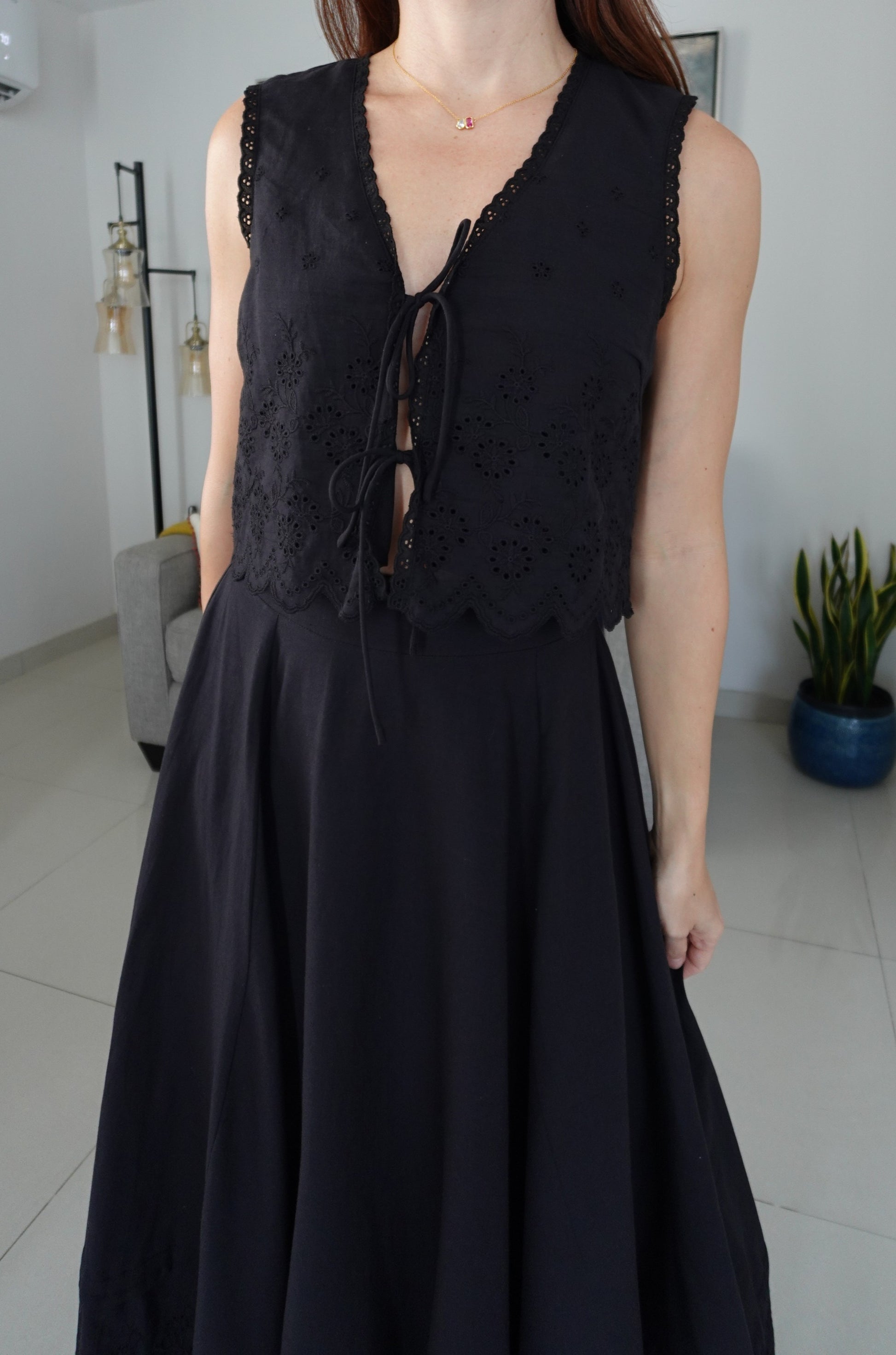 Eyelet embroidery sleeveless scalloped hem crop top with front self tie closure and matching midi skirt set. Skirt has back invisible zipper. Lining.