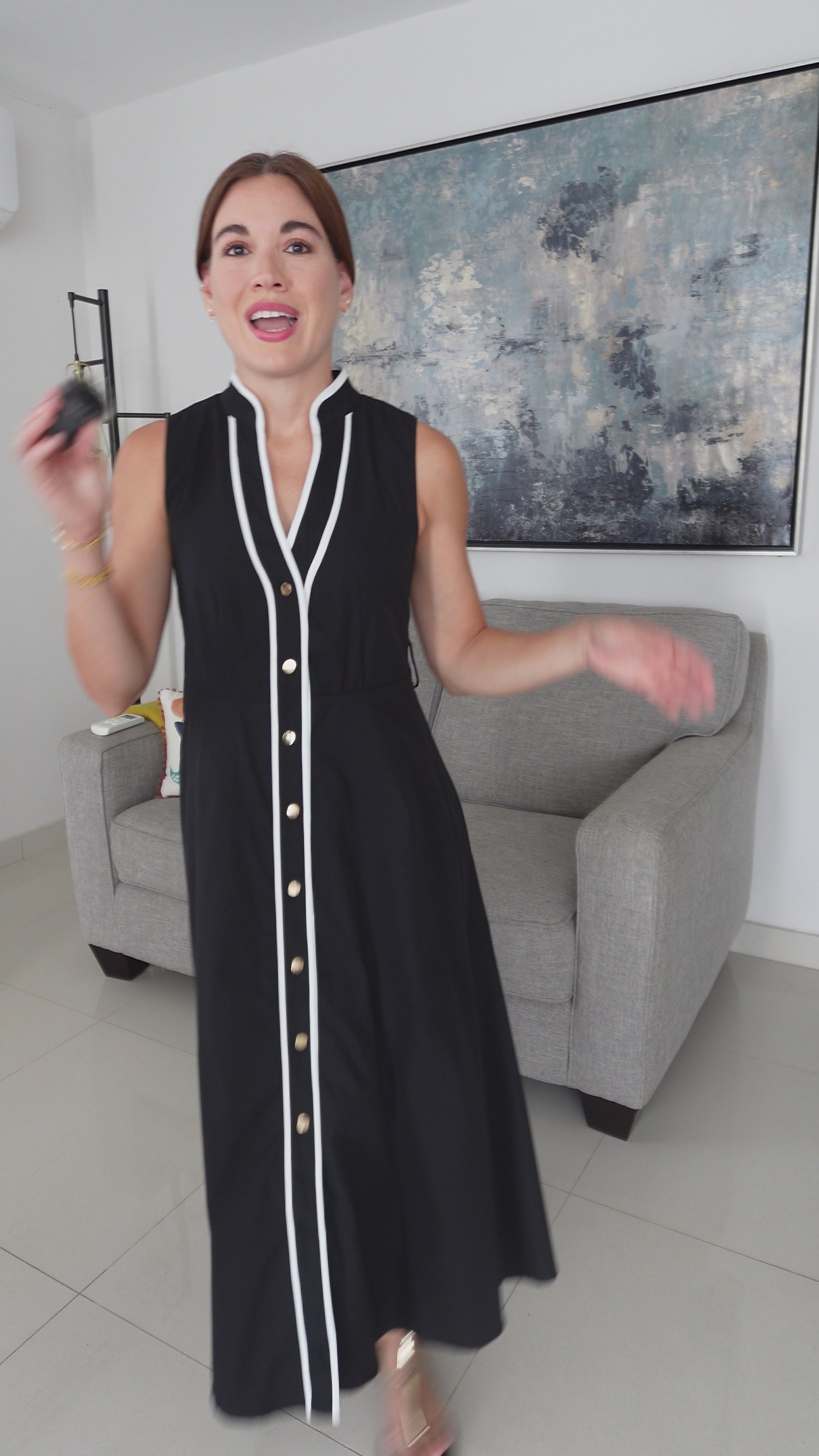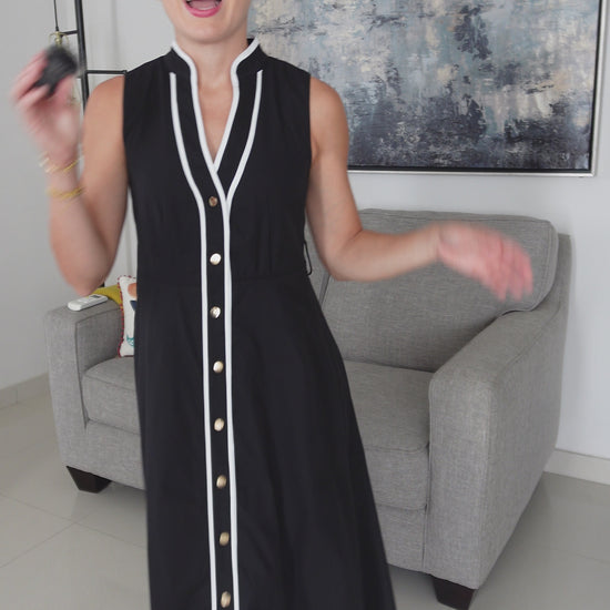 Women woven solid contrast sleeveless button-down maxi dress with belt.