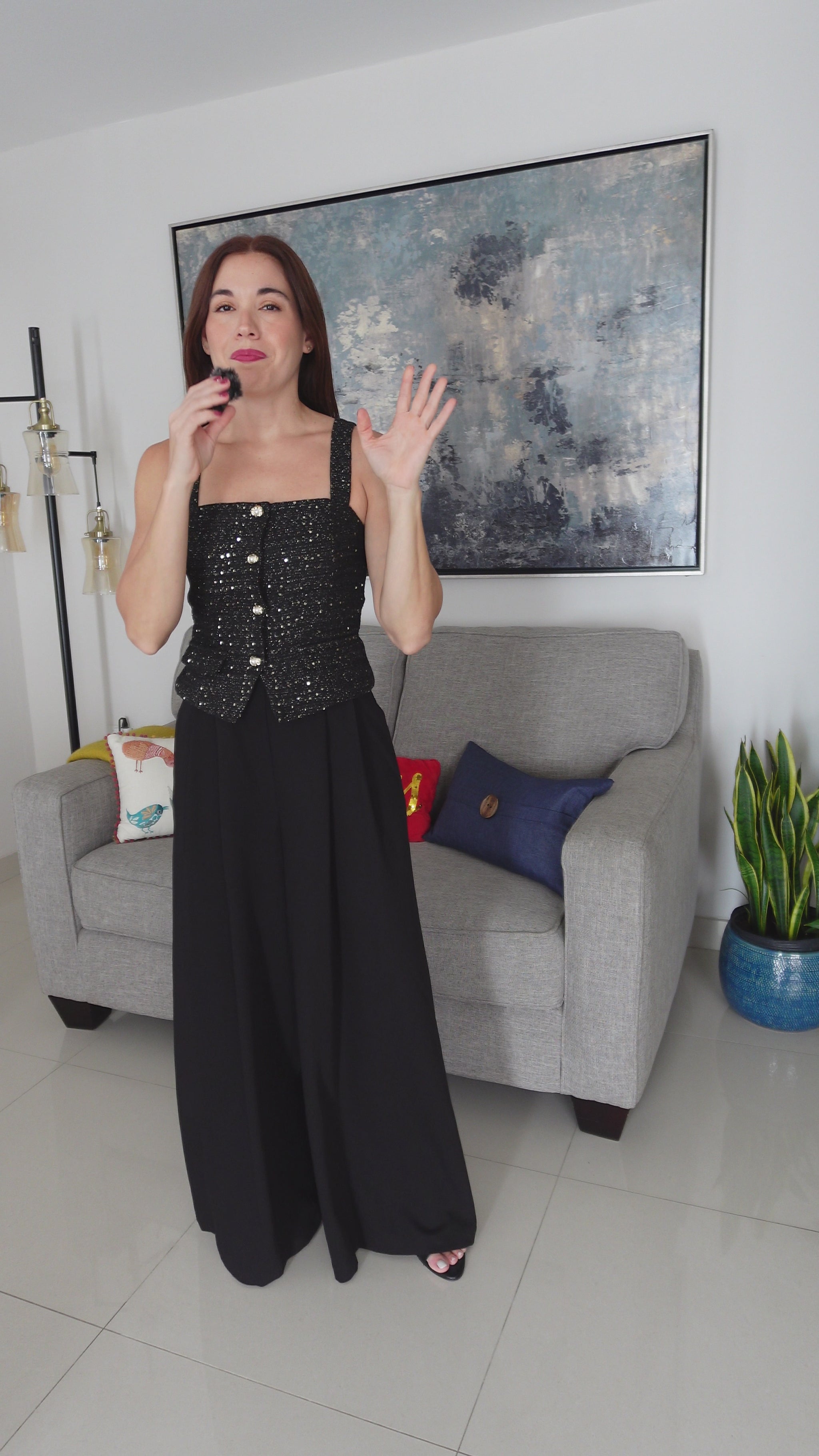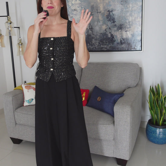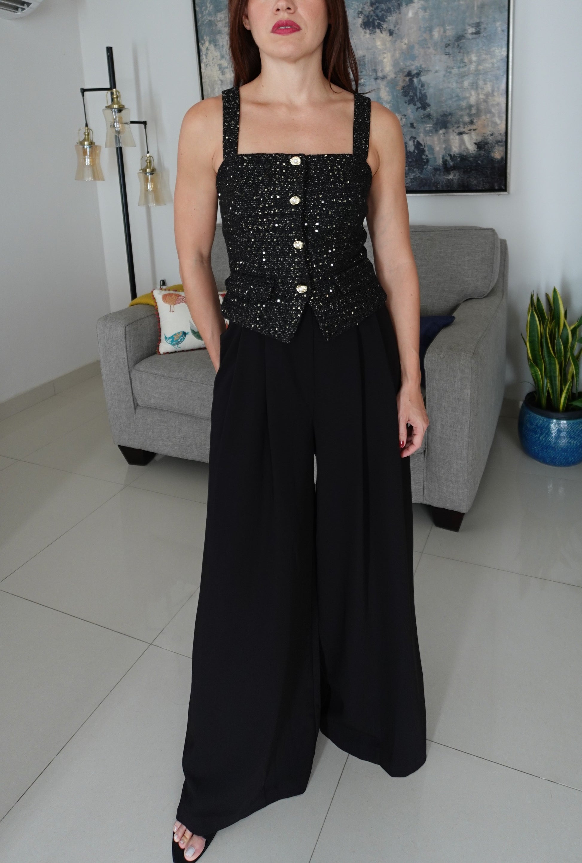 A woven jumpsuit featuring tweed bodice with straight neckline and strap, button down detail, solid woven wide leg pant and back zipper closure.